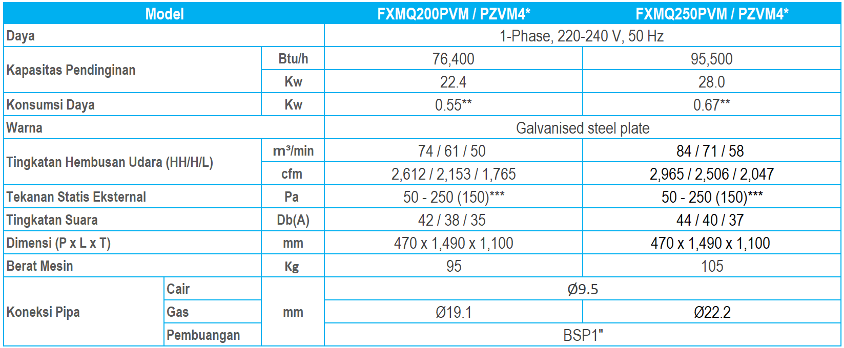 - Pendinginan: Suhu dalam ruangan: 27°CDB, 19°CWB, Suhu luar ruangan: 35°CDB, Panjang pipa setara: 7,5 m, Perbedaan ketinggian: 0 m.