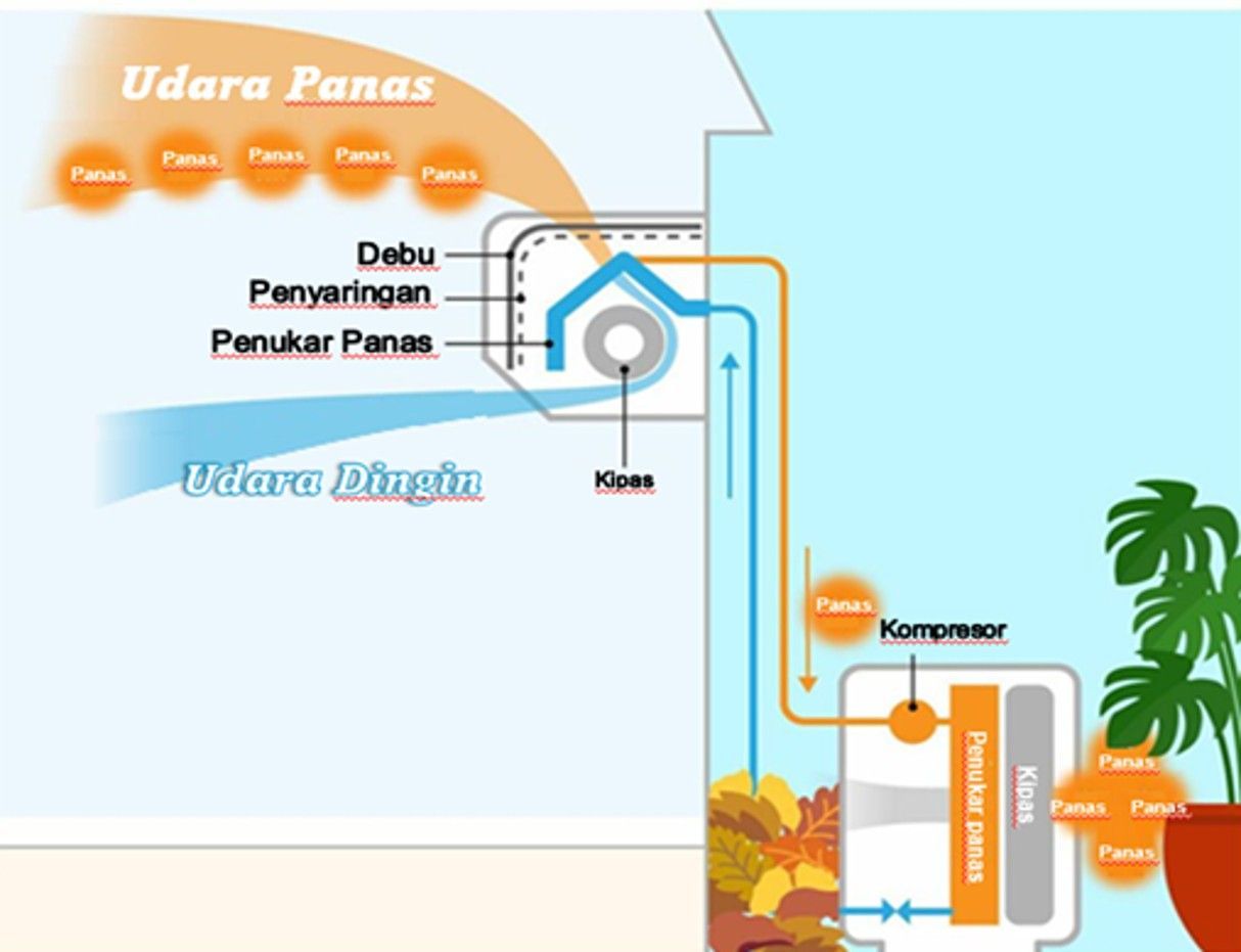 Secara sederhana, AC mendinginkan ruangan dengan cara menarik udara dari dalam ruangan melalui unit indoor untuk menyerap panas, lalu mengembalikan udara tersebut dalam kondisi lebih sejuk setelah panasnya dihilangkan.