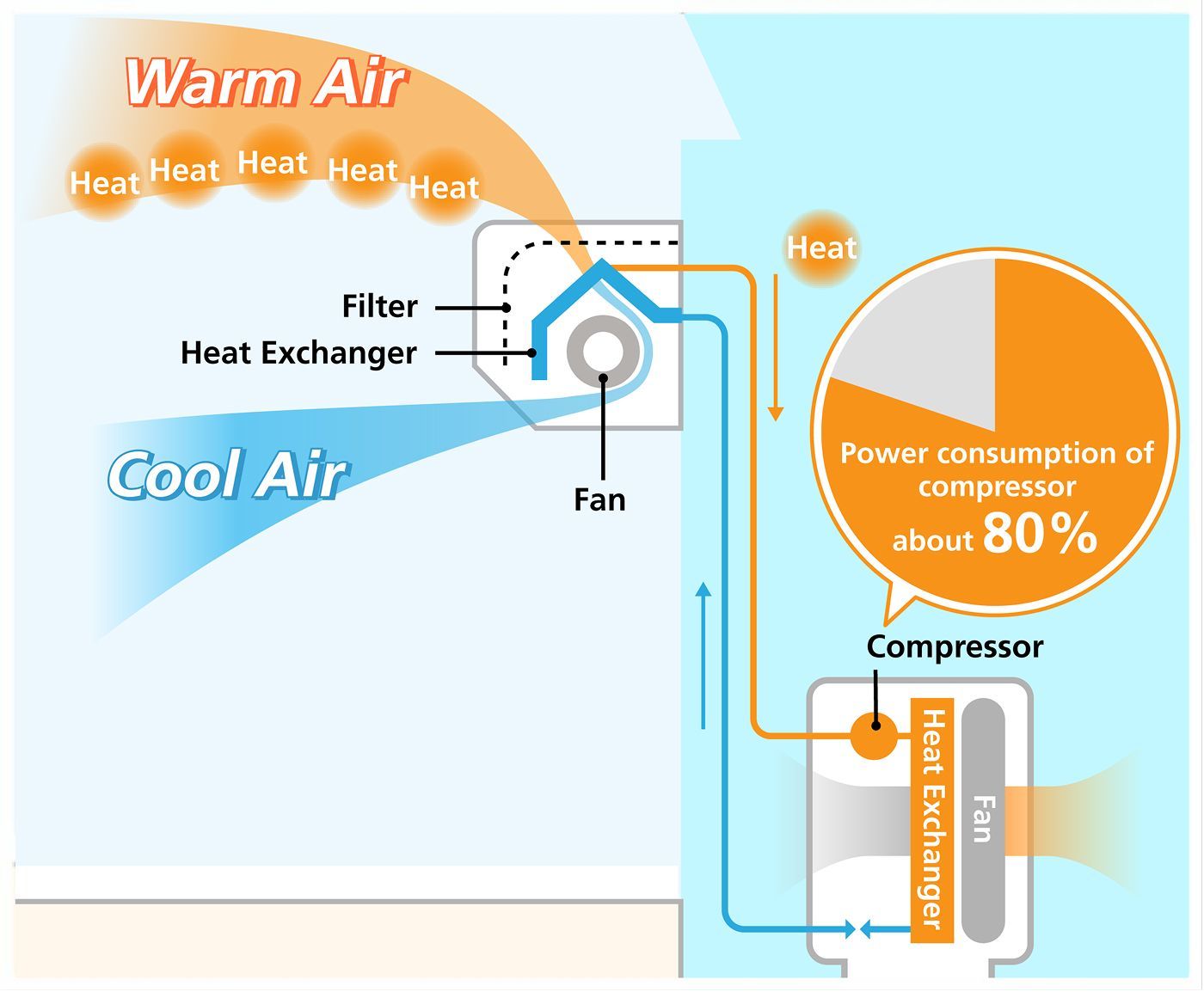 AC mendinginkan ruangan dengan cara unit indoor menarik udara dari dalam ruangan untuk menyerap panas, lalu mengembalikan udara tersebut sebagai udara dingin yang telah kehilangan panasnya. Panas yang diserap dari udara dalam ruangan kemudian dipindahkan ke unit outdoor melalui gas yang disebut refrigeran, yang mengalir melalui pipa yang menghubungkan unit indoor dan outdoor. Selanjutnya, unit outdoor akan melepaskan panas tersebut ke luar ruangan. Dalam proses ini, kompresor berperan sangat penting untuk memampatkan refrigeran dan mengalirkannya di dalam pipa agar dapat menyerap serta melepaskan panas.