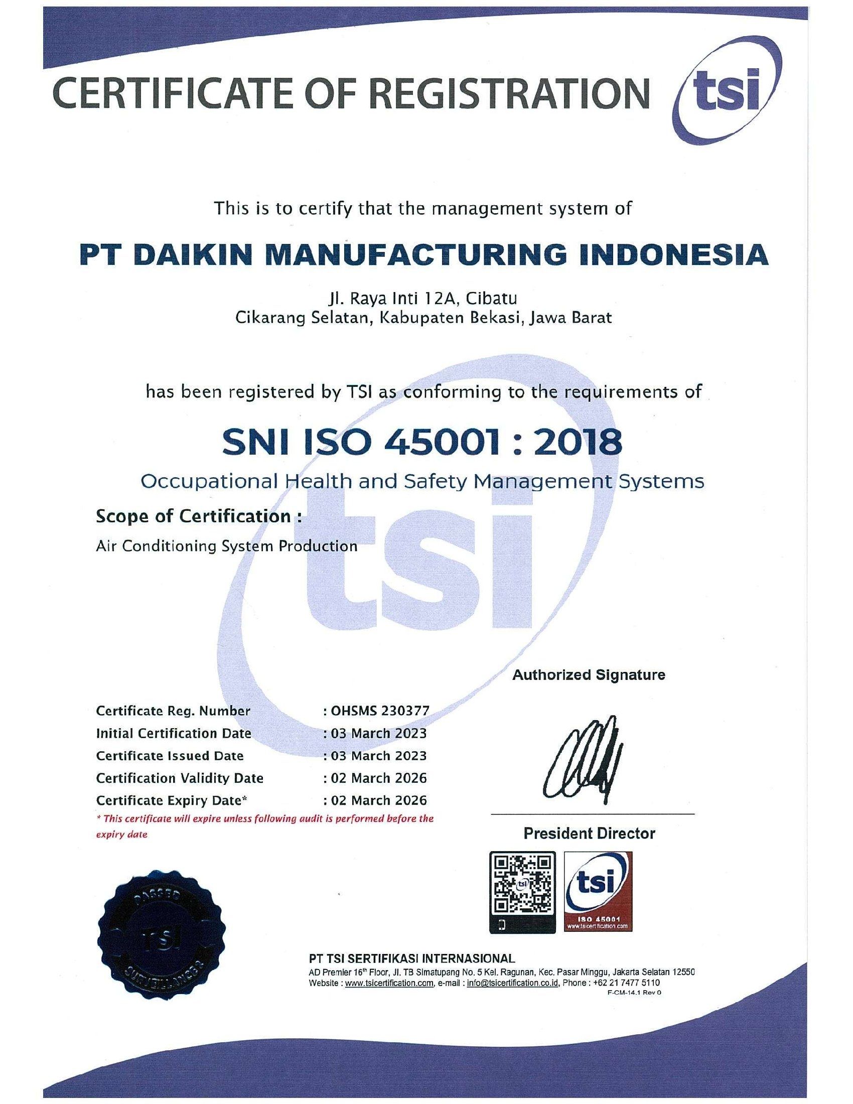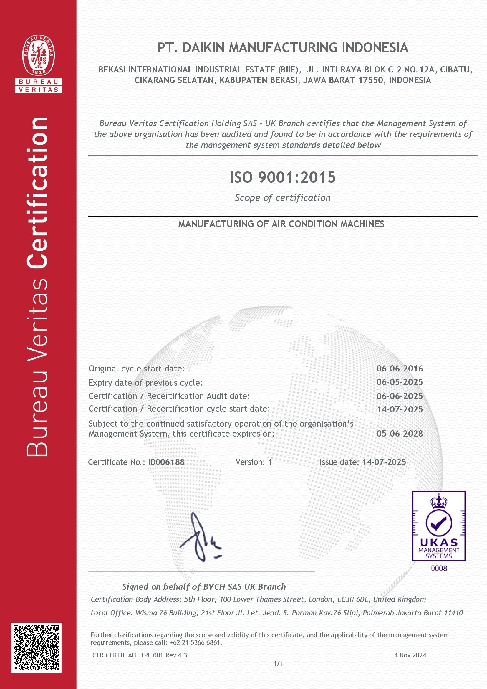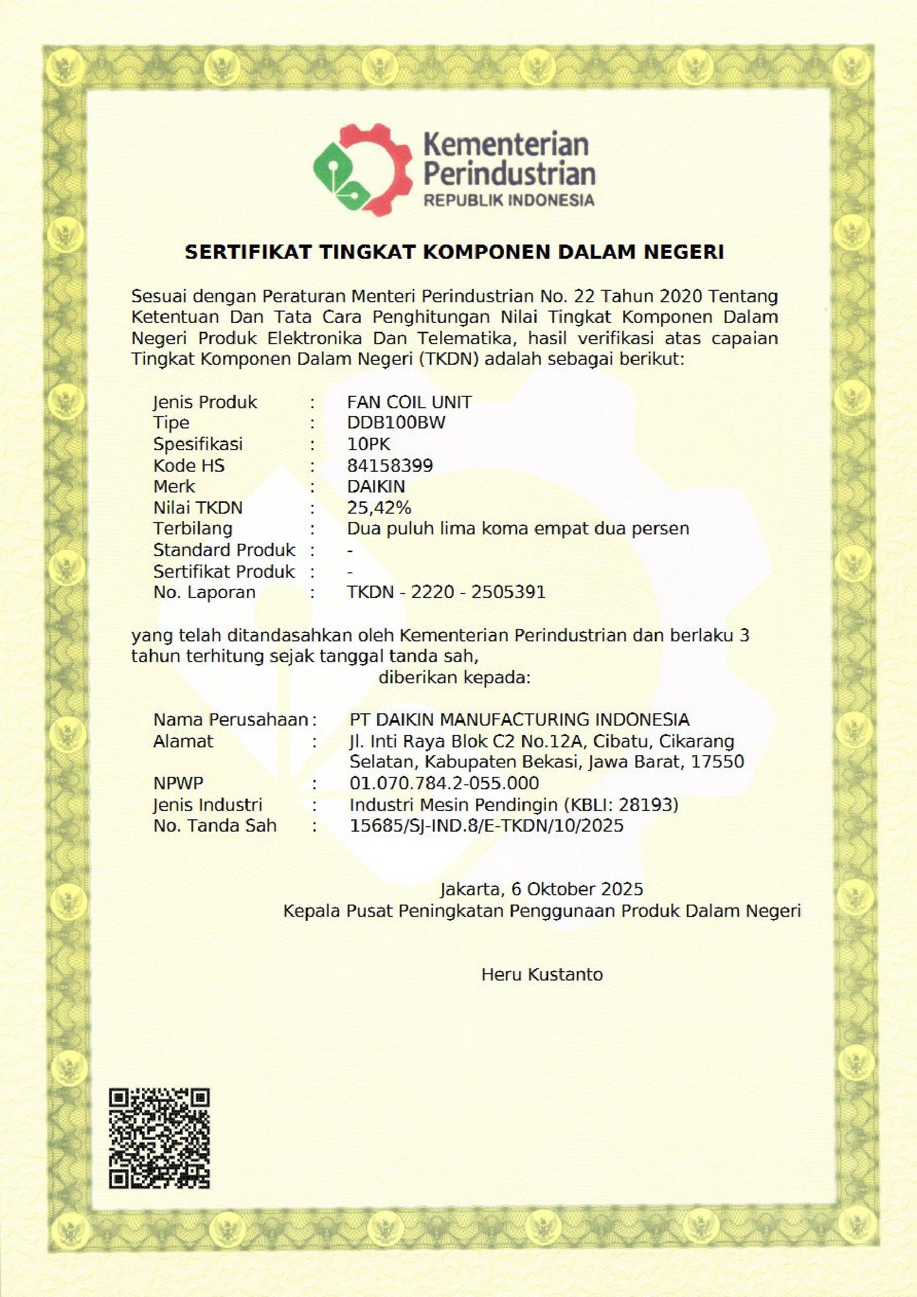 PT Daikin Manufacturing Indonesia adalah pabrik resmi DAIKIN di Indonesia yang memproduksi sistem HVAC komersial, memasok produk ke PT Daikin Airconditioning Indonesia dan PT Daikin Applied Solution Indonesia, serta mendukung kualitas global DAIKIN.